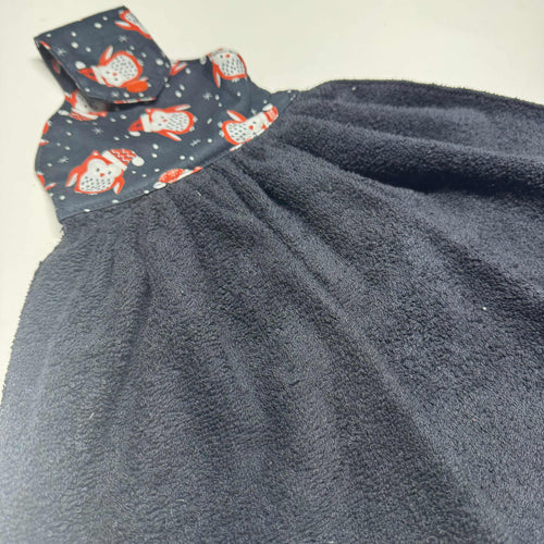 Fait de coton et ratine, avec un rabat (snap) pour accrocher à la poignée du four ou autre.