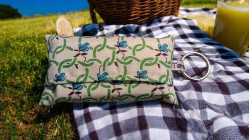 Paquet de mouchoirs (jetable) avec pochette en tissus et anneau porte-clé pour pouvoir le réutiliser.